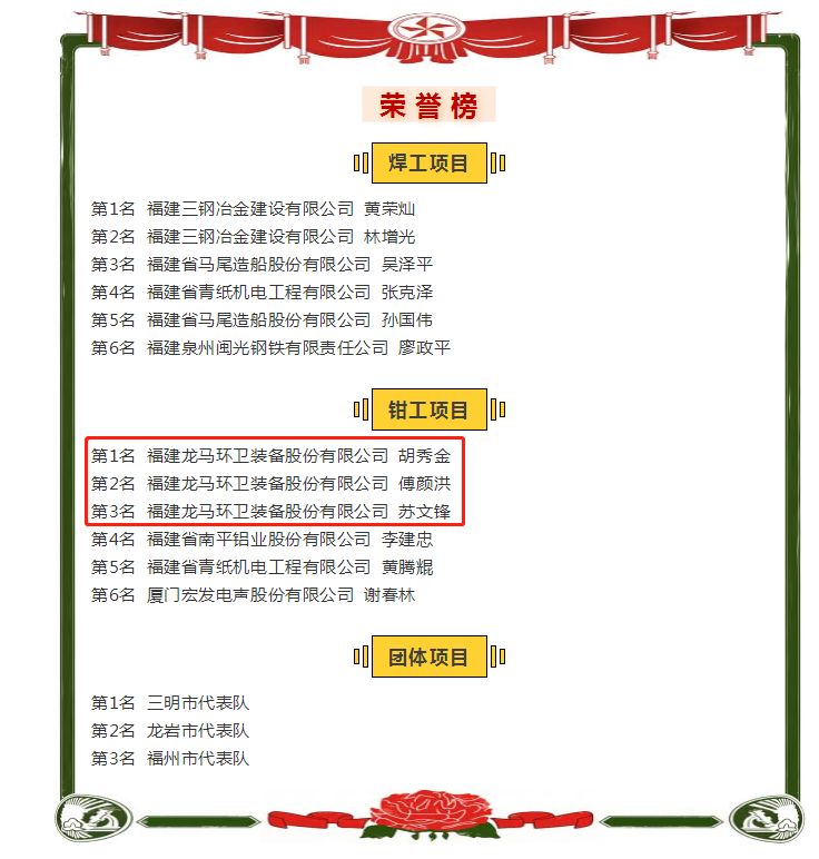 我司胡秀金、 傅顏洪、蘇文鋒包攬省鉗工項目選拔賽前三名,分獲冠、亞、季軍。實現(xiàn)龍巖市乃至福建省鉗工競賽成績歷史性的突破。