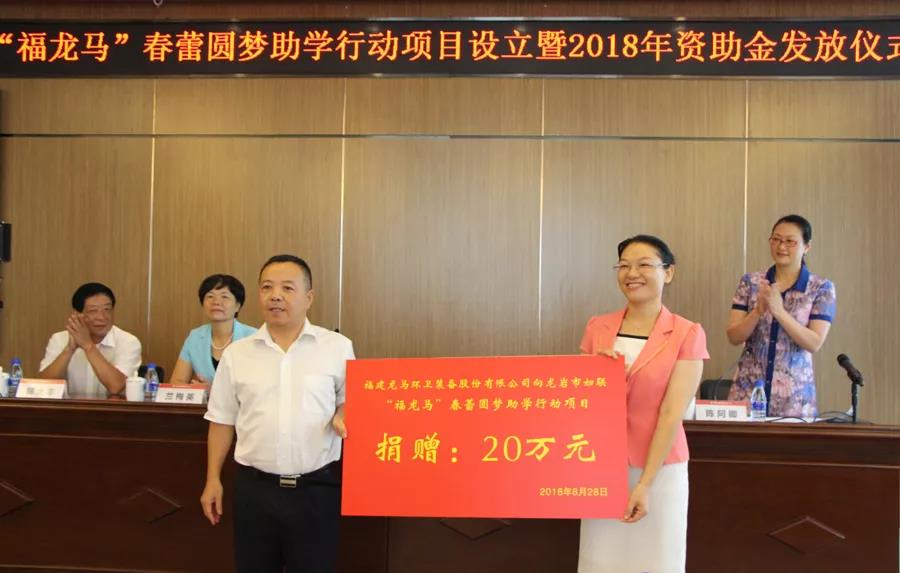 在新學(xué)期即將來(lái)臨之際,8月28日上午,龍巖市婦聯(lián)、福建龍馬環(huán)衛(wèi)裝備股份有限公司、市慈善總會(huì)聯(lián)合舉行“福龍馬”春蕾圓夢(mèng)助學(xué)行動(dòng)項(xiàng)目設(shè)立暨2018年資助金發(fā)放儀式,為我市40名高中應(yīng)屆畢業(yè)的貧困優(yōu)秀女大學(xué)生每人一次性給予資助5000元。龍巖市婦聯(lián)黨組書記、主席藍(lán)凱英,福建龍馬環(huán)衛(wèi)裝備股份有限公司董事、財(cái)務(wù)總監(jiān)楊育忠,龍巖市慈善總會(huì)副秘書長(zhǎng)郭大豐,各縣(市、區(qū))婦聯(lián)主席,市直機(jī)關(guān)婦工委主任,市婦聯(lián)全體干部職工,福龍馬公司員工代表及受助貧困女大學(xué)生代表等參加活動(dòng)。