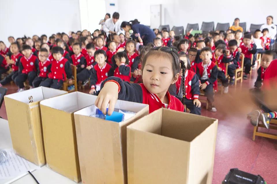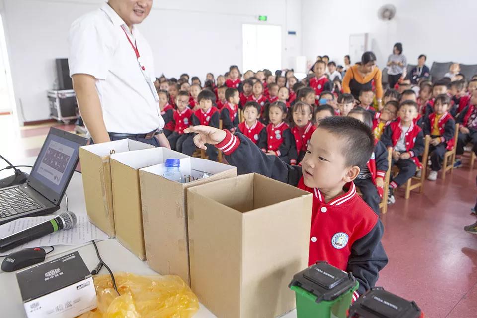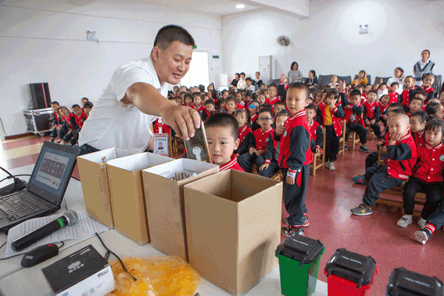“叔叔,這個(gè)本子放哪個(gè)箱子里呢?”小朋友舉著杯子在現(xiàn)場(chǎng)提問,進(jìn)校宣講員耐心指引,手把手教孩子們識(shí)別垃圾的類別,正確做到垃圾分類。