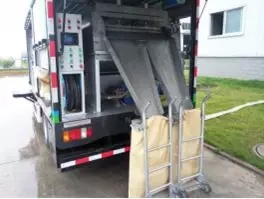 利用吸污泵將化糞池內(nèi)混合物或其它待處理物抽至格柵機(jī)中,混合物中的塑料袋、石塊、金屬等雜物分離壓縮至格柵機(jī)中內(nèi),而污水懸濁物被送至攪拌箱中,泡藥箱中泡制好的絮凝劑藥水經(jīng)藥泵泵入攪拌箱中與污水?dāng)嚢栊跄磻?yīng),絮凝反應(yīng)的混合液排入脫水機(jī)進(jìn)行渣液分離,分離后的排放水能達(dá)到國(guó)家三類水質(zhì)標(biāo)準(zhǔn),可直接排放,分離出的固態(tài)有機(jī)物無異味、無毒害,經(jīng)由車尾排出。