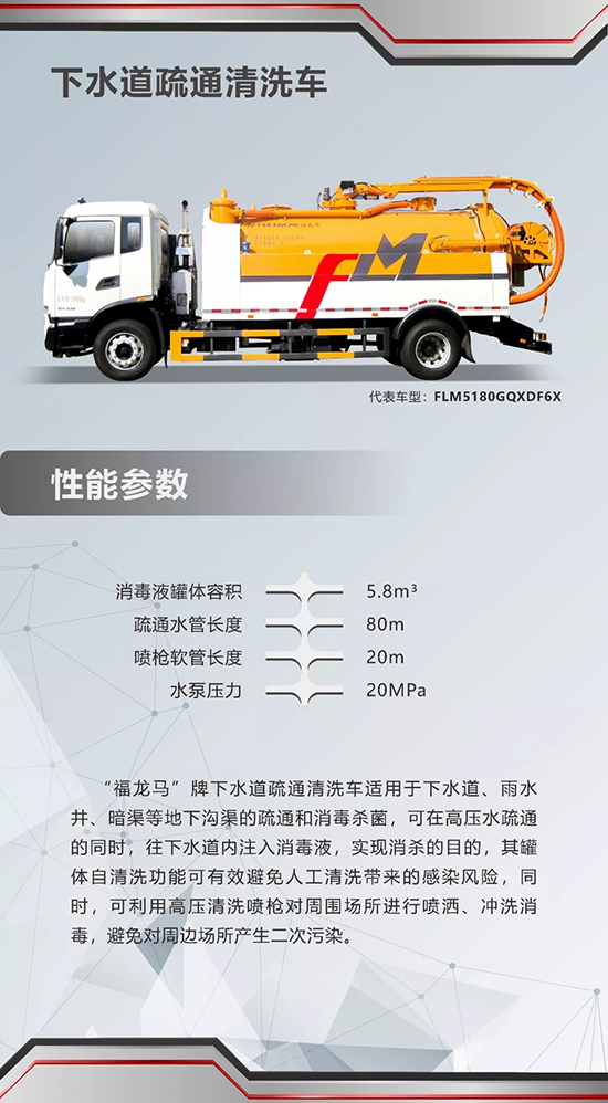 “福龍馬”牌下水道疏通清洗車適用于下水道、雨水井、暗渠等地下溝渠的疏通和消毒殺菌,同時,可利用高壓清洗噴槍對周圍場所進行噴灑、沖洗消毒,避免對周邊場所產(chǎn)生二次污染。