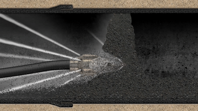 疏通水管前端噴頭噴沖高壓水對淤堵管網(wǎng)進行疏通