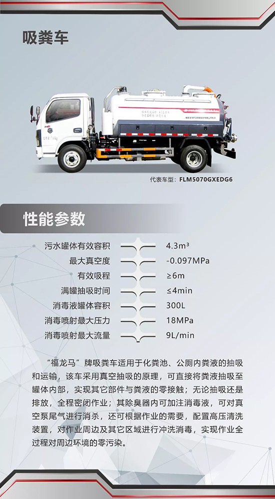 “福龍馬”牌吸糞車,適用于化糞池、公廁內(nèi)糞液的抽吸和運輸,該車采用真空抽吸的原理,可直接將糞液抽吸至罐體內(nèi)部,實現(xiàn)其它部件與糞液的零接觸;無論抽吸還是排放,全程密閉作業(yè),可有效杜絕運輸過程中出現(xiàn)的滴、灑、漏現(xiàn)象。