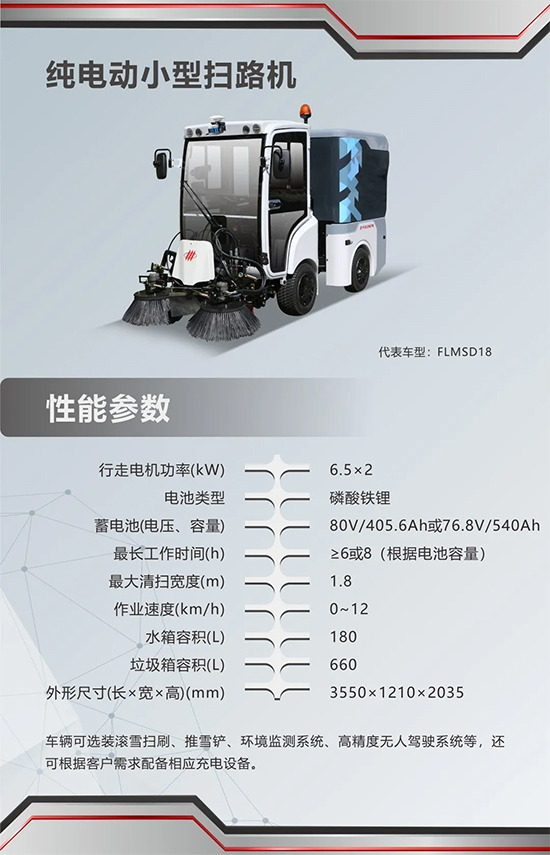 FLMSD18純電動(dòng)掃路機(jī)是龍馬環(huán)衛(wèi)全新開發(fā)、性能領(lǐng)先于行業(yè)的智能化清掃設(shè)備,具有路面清掃、高壓水清洗、污水循環(huán)利用等功能。整機(jī)造型美觀,機(jī)動(dòng)靈活,清掃能力強(qiáng),是環(huán)衛(wèi)裝備智能化發(fā)展中的標(biāo)桿產(chǎn)品。