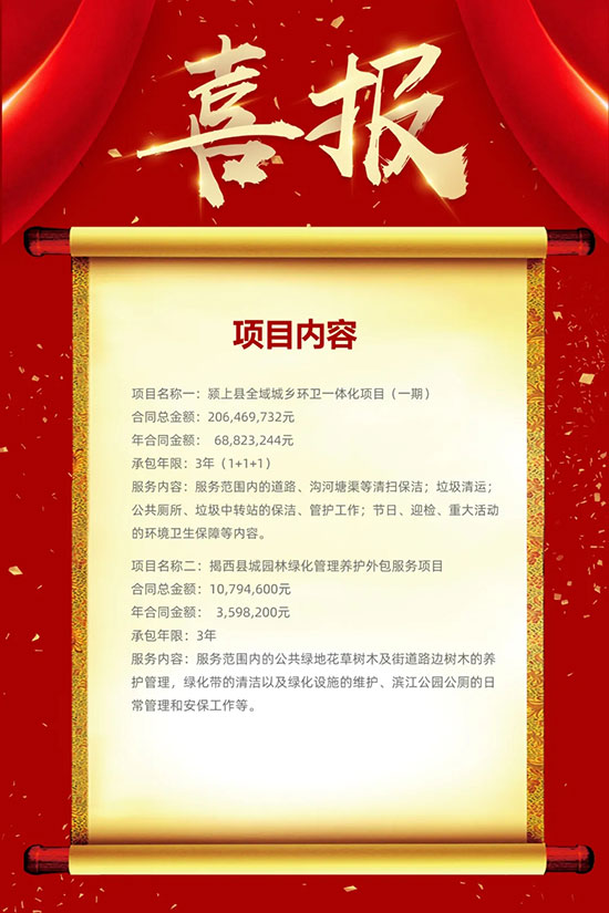 近日,福建龍馬環(huán)衛(wèi)裝備股份有限公司(以下簡稱“公司”)陸續(xù)收到《中標(biāo)通知書》。確認(rèn)公司中標(biāo)安徽省阜陽市潁上縣全域城鄉(xiāng)環(huán)衛(wèi)一體化項(xiàng)目(一期)和廣東省揭陽市揭西縣城園林綠化管理養(yǎng)護(hù)外包服務(wù)項(xiàng)目。