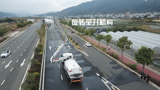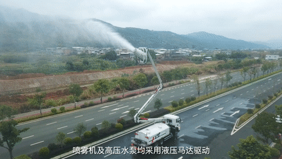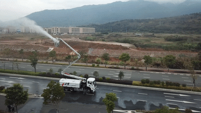 該車采用折疊式舉升臂架,可將噴霧機(jī)舉升至高空進(jìn)行噴霧作業(yè)。該產(chǎn)品基于傳統(tǒng)抑塵車的風(fēng)送式噴霧技術(shù),新增了由多節(jié)折疊臂架構(gòu)成的旋轉(zhuǎn)舉升機(jī)構(gòu),極大提高了抑塵車的作業(yè)范圍,改善了噴霧抑塵效果。