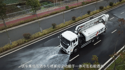 該車集低壓灑水與噴霧抑塵功能于一體可左右前灑水、左右側(cè)沖洗、左右后灑水、低空行車或駐車噴霧、高空駐車噴霧等功能。