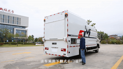 該車采用下翻式后門設(shè)計(jì),與提升機(jī)構(gòu)、夾緊機(jī)構(gòu)合為一體,可有效保障操作人員的人生安全。
