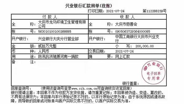 本次捐贈物資中,包括價值近250萬元的灑水車、壓縮式垃圾車共計10臺的環(huán)衛(wèi)專用設(shè)備,用于受災(zāi)區(qū)域的路面清淤沖洗;向鄭州市紅十字會、新鄉(xiāng)市慈善總會、大慶市慈善會等公益組織合計捐贈現(xiàn)金100萬元;向受災(zāi)人民捐贈價值20余萬的雨衣、濕紙巾及衛(wèi)生巾等生活用品,上述捐贈物資均定向用于河南防汛抗洪。