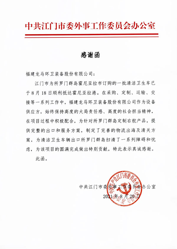 近日,龍馬環(huán)衛(wèi)收到中共江門市委外事工作委員會(huì)辦公室發(fā)來的感謝信,感謝龍馬環(huán)衛(wèi)作為設(shè)備供應(yīng)方,在江門市為所羅門群島霍尼亞拉市訂購清潔衛(wèi)生車系列工作中做出的貢獻(xiàn)。